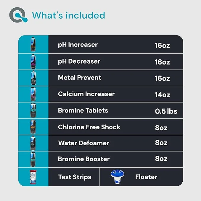 • Includes bromine tablets, booster, pH adjusters, and test strips